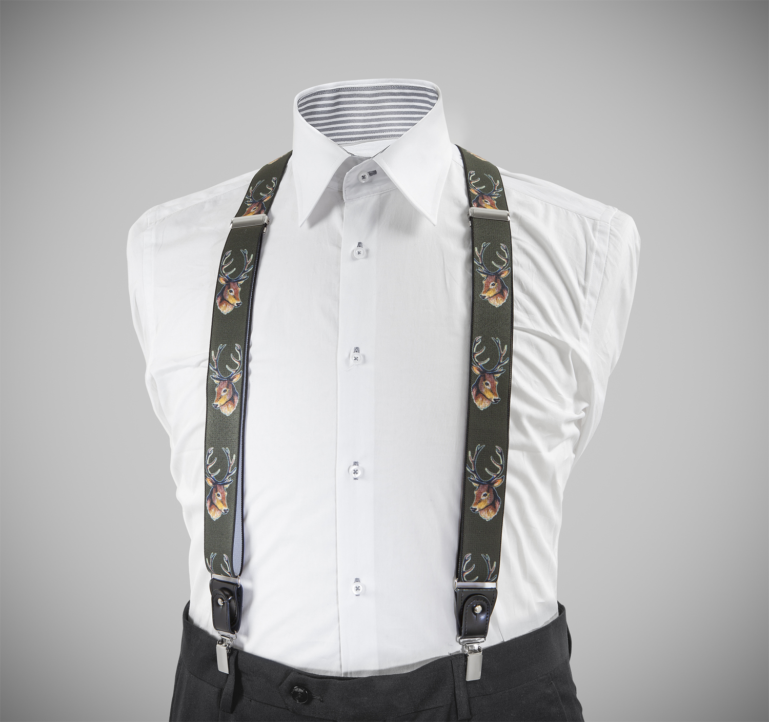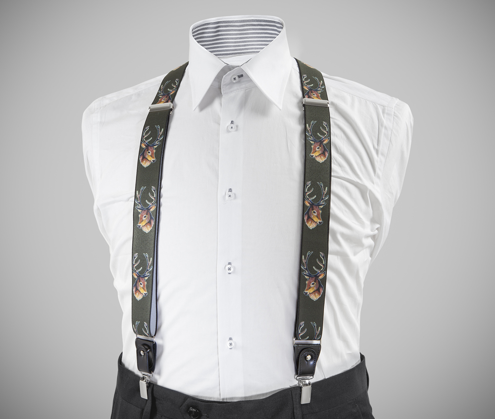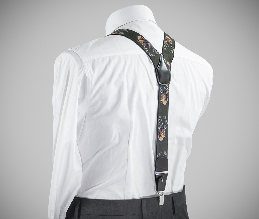 "High-quality, adjustable-size braces, 35mm width, country style, made with resilient material, green finished with a deer figure finely reproduced. Metal chrome clip and leather-strap button fasten, included."
