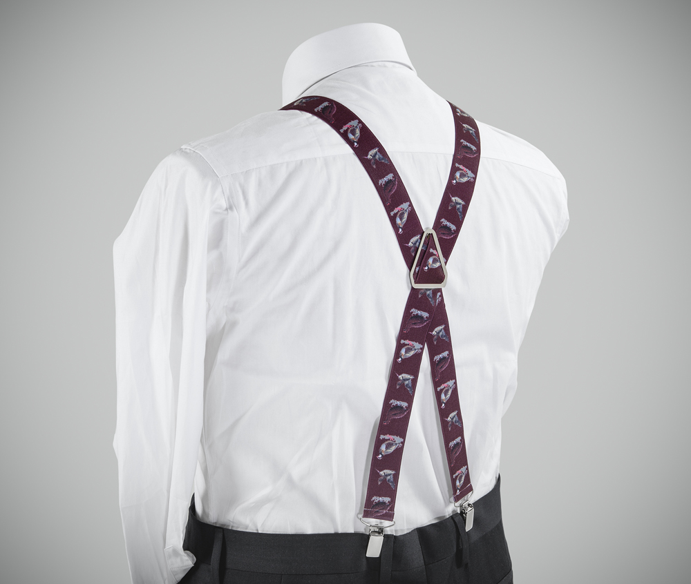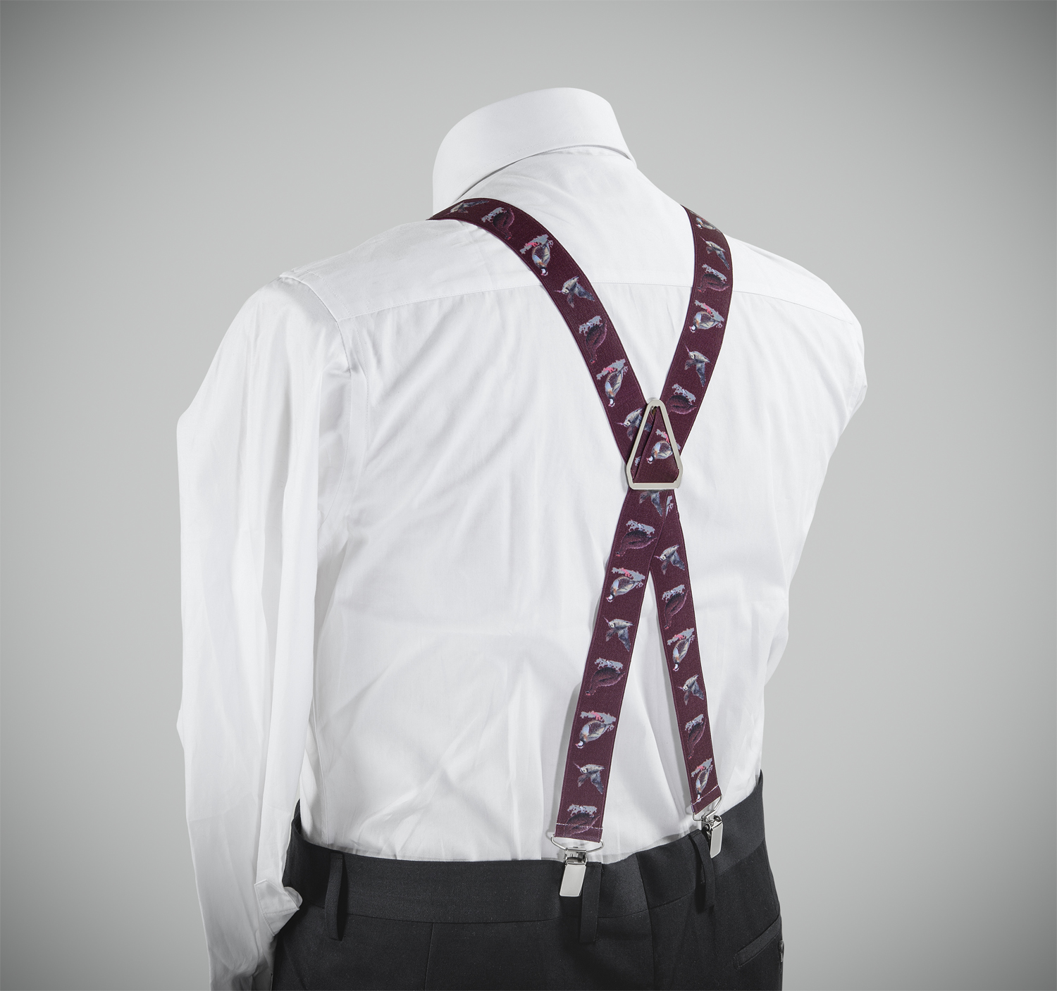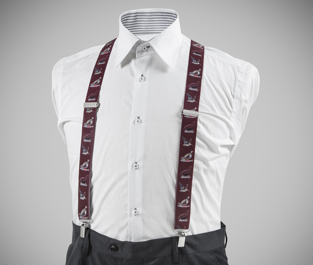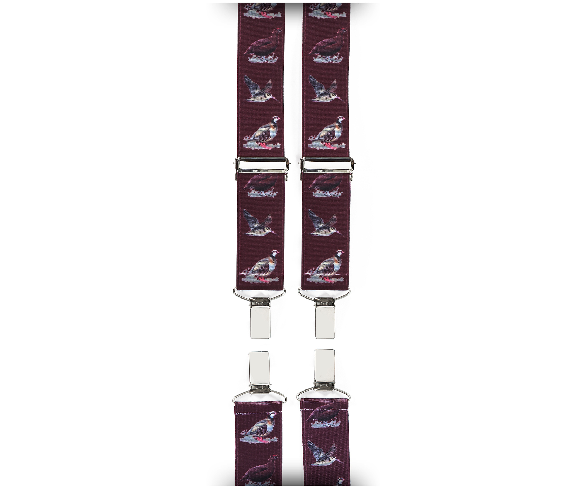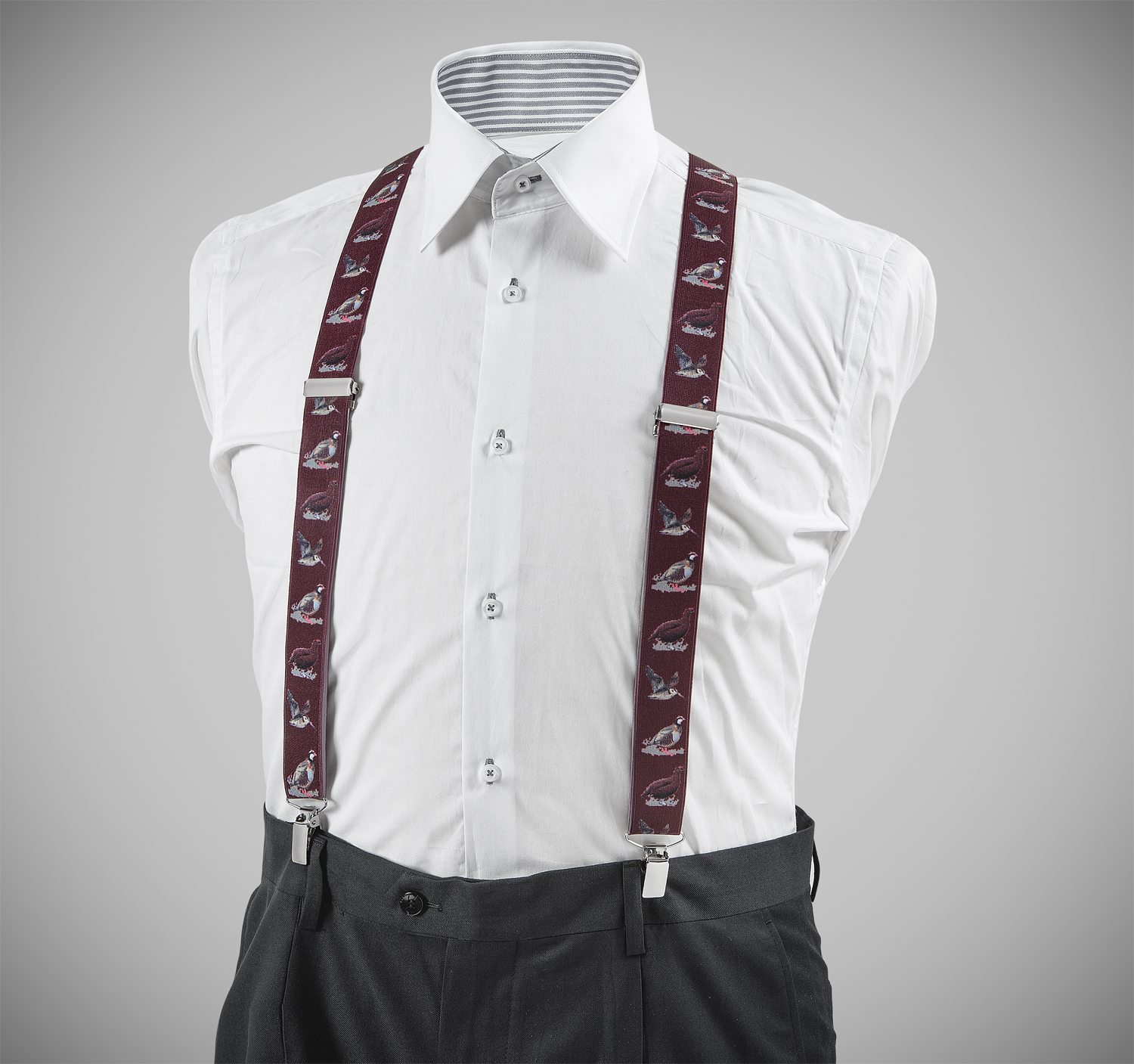 "High-quality, adjustable-size braces, 35mm width, country style, made with resilient fabric, amaranth red, with some wild bird figures finely reproduced. Available with metal chrome clip fasten."